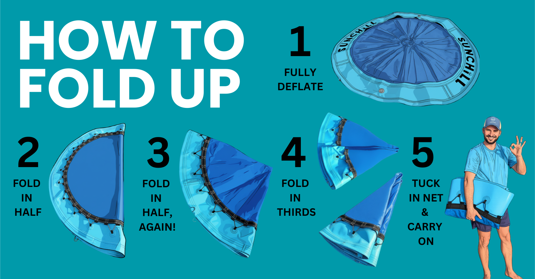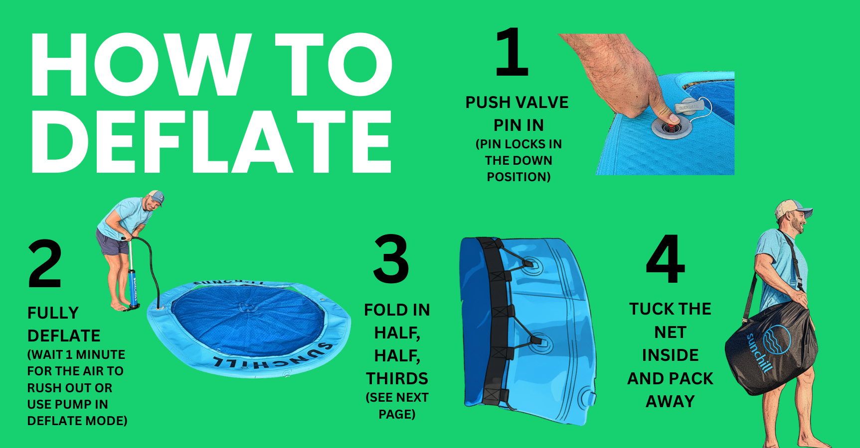 - To fold up the Partychill, the first step is to deflate it, whether that is with a pump, with time, or by pushing the air out. Once it is mostly deflated, you can fold the two circles on top of each other and now you just have a "double Sunchill" and fold like the video, in half, half again, and then in thirds. You end up with a flat rectangle that slides right into the bag.